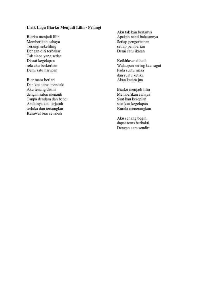 Biar Ku Menjadi Lilin Biarku menjadi lilin Memberikan cahaya Terangi sekeliling dengan diri terbakar Tak siapa yang sedar Disaat kegelapan rela aku berkorban Demi satu harapan Biar masa berlari Dan kau terus mendaki Aku tenang disini dengan sabar menanti Tanpa dendam dan benci Andainya kau terjatuh terluka dan tersungkur Kurawat biar sembuh Aku tak kan bertanya. Lirik Lagu Biarku Menjadi Lilin Pdf Biarku Menjadi Lilin Pdf Biar Ku Menjadi Lilin Pdf Biarku Menjadi Lilin Song Lyrics And Music By Pelangi Arranged By Muhammadbebeni On Smule Social Singing App Related. Lirik Lagu Pink Venom dari BLACKPINK dan Terjemahan Bahasa Indonesia.