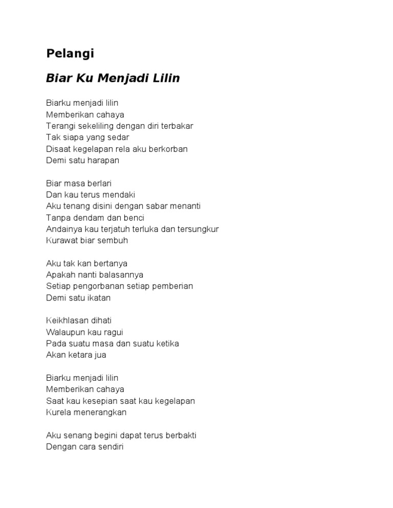 Lirik Lagu Biarku Menjadi Lilin - Pelangi. Akan ketara jua. Biar ku menjadi lilinBiarku menjadi lilinMemberikan cahayaTerangi sekeliling dengan diri terbakarTak siapa yang sedarDisaat kegelapan rela aku berkorbanDemi.