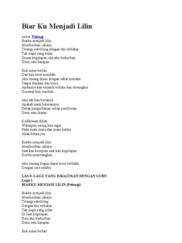 Lirik Lagu Biarku Menjadi Lilin - Pelangi Biarku menjadi lilin Memberikan cahaya Terangi sekeliling Dengan diri terbakar Tak siapa yang sedar Disaat kegelapan rela aku berkorban Demi satu harapan Biar masa berlari Dan kau terus mendaki Aku tenang disini dengan sabar menanti Tanpa dendam dan benci Andainya kau terjatuh terluka dan tersungkur Kurawat biar sembuh. Pelangi telah mengeluarkan 5 studio album iaitu Kisah Baba Dan Nyo. Sesuai untuk lagu persembahan Hari Guru.